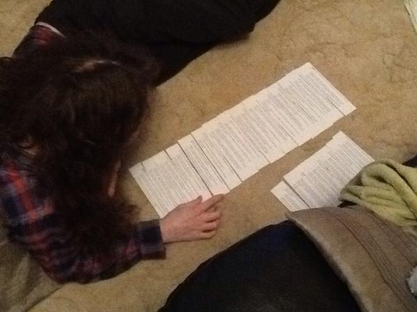 Over the course of the day, Mark wrote out all the possible letters we wanted to have in the game and the outcomes of each of them. He then printed them off and cut them out in order to arrange them into a cohesive story. PHYSICAL PROTOTYPING FTW!
